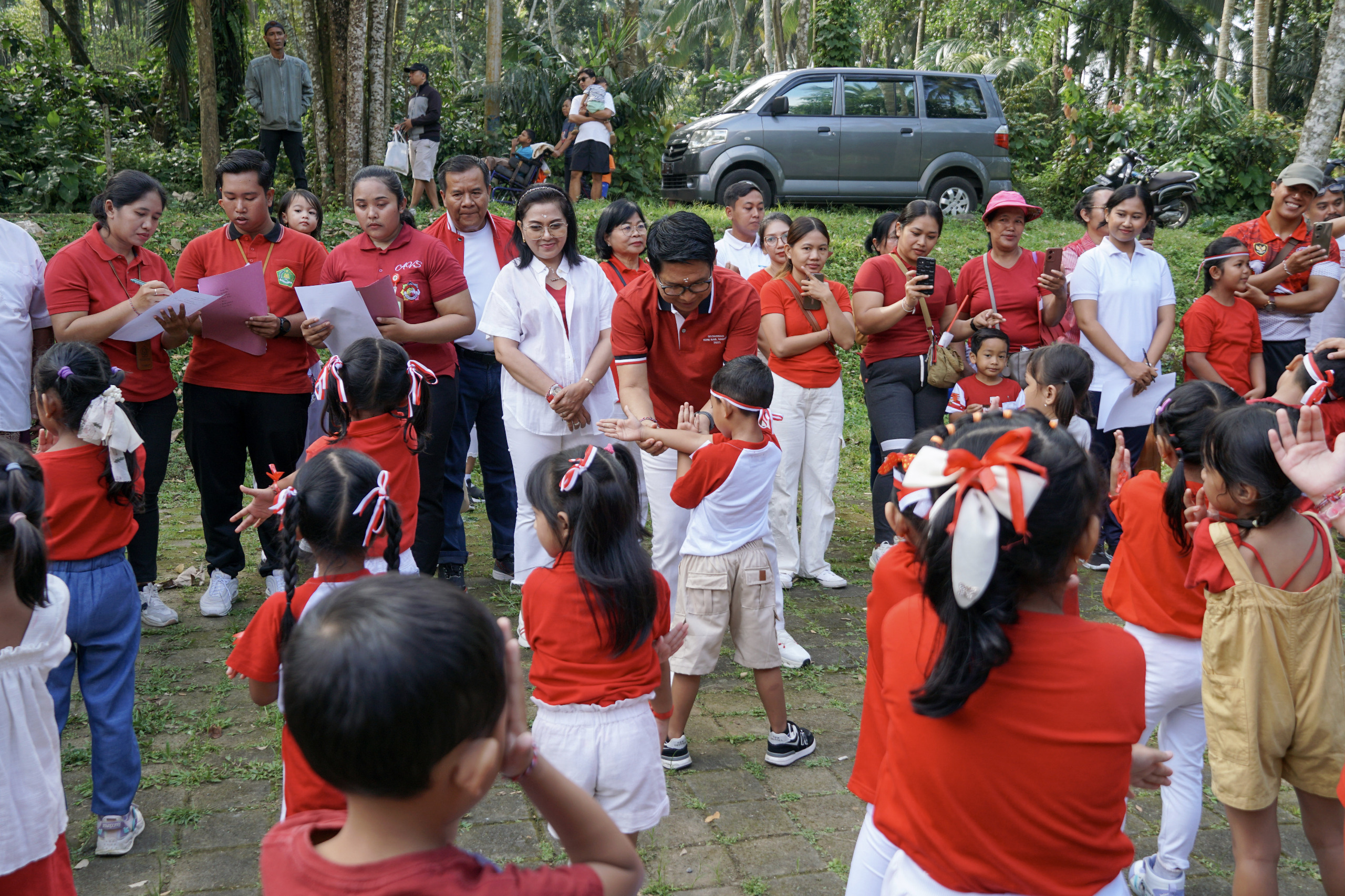 Bupati Wayan Adi Arnawa bersama Bunda PAUD Kabupaten Badung Nyonya Rasniathi Adi Arnawa hadir dalam kegiatan HUT Ke-20 di Wantilan Pura Taman Sari, Br. Batur Sari Sangeh, Abiansemal, Senin (18/8).