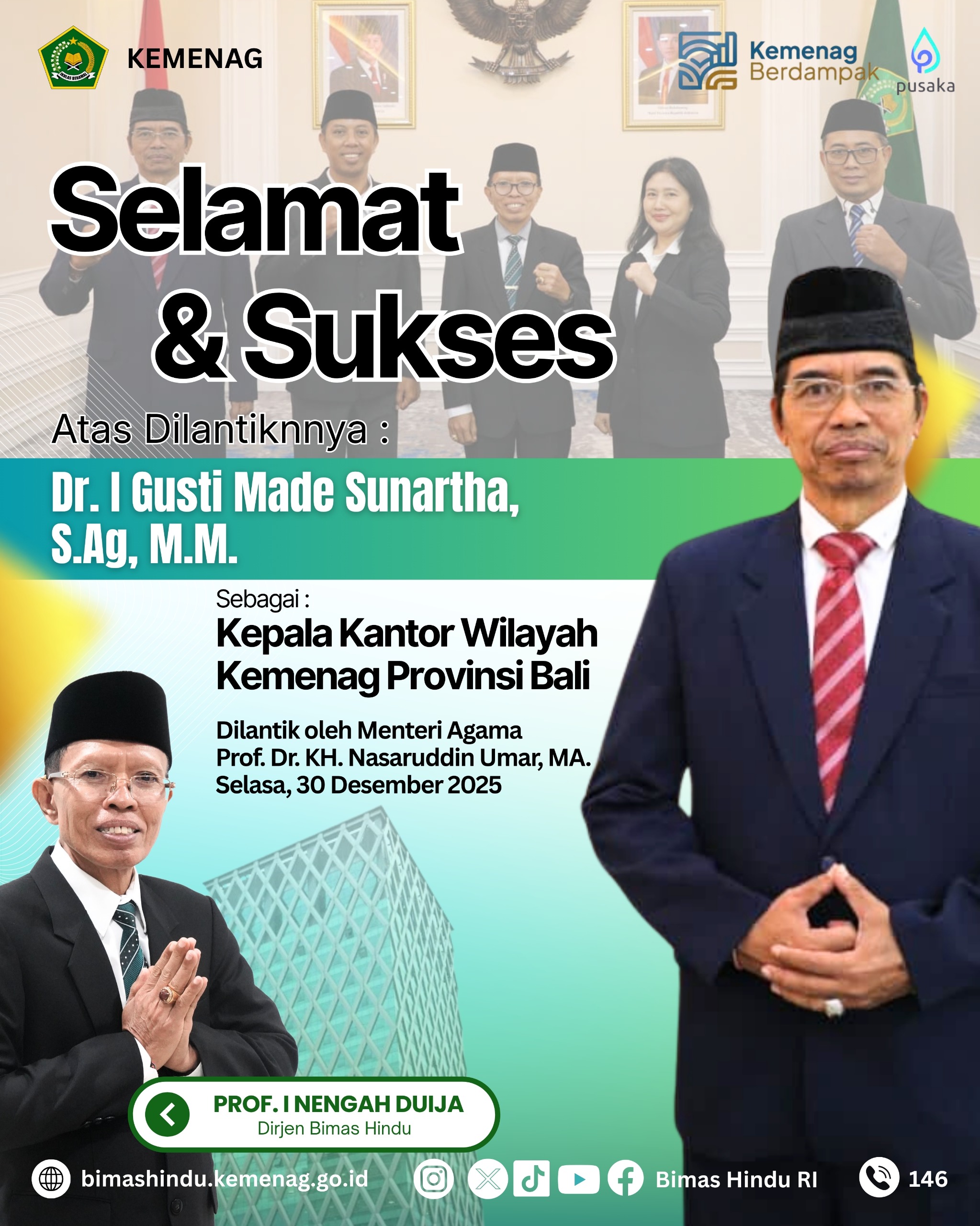 Karir Dr. I Gusti Made Sunartha, S.Ag, M.M di Kementerian Agama memasuki babak baru. Pria kelahiran Kemenuh, Gianyar, 31 Desember 1969 ini dilantik sebagai oleh Menteri Agama Republik Indonesia Prof. Dr. KH. Nasaruddin Umar, MA sebagai Kepala Kantor Wilayah Kementerian Agama Provinsi Bali pada Selasa (30/12/2025) di Jakarta. Pelantikan ini langsung diumumkan secara luas oleh Dirjen Bimas Hindu Kementerian Agama RI, Prof. Dr. Drs. I Nengah Duija, M.Si melalui media, baik mainstream maupun media sosial.
