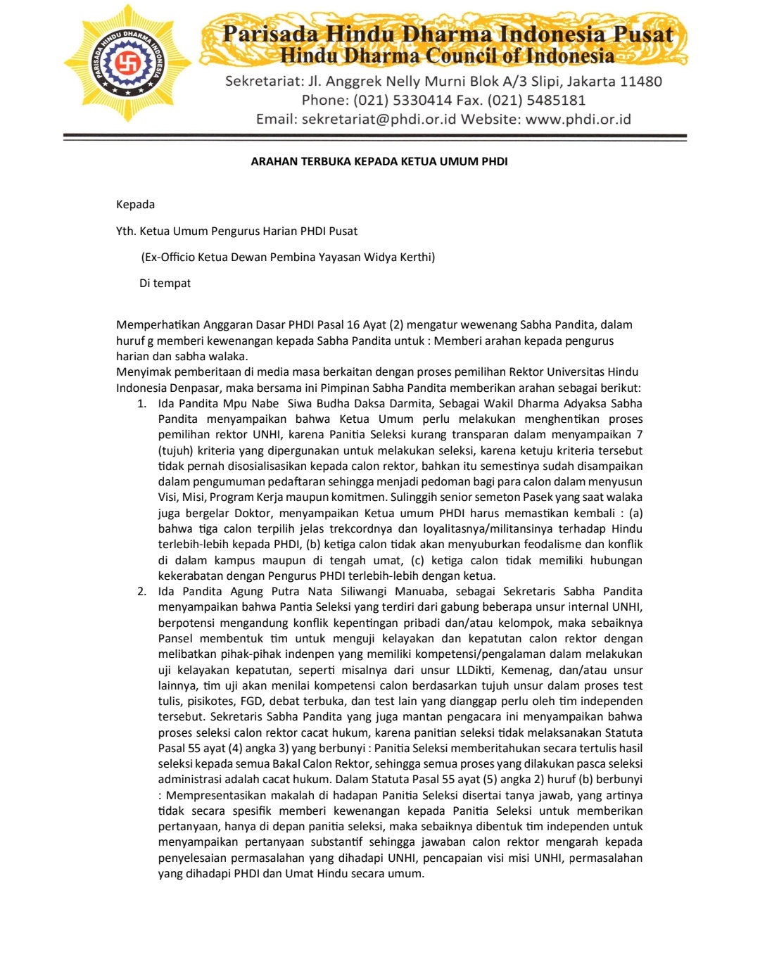 Surat itu berisi statemen Ida Pandita Mpu Siwa Buda Daksa Darmita atau yang lebih dikenal sebagai Ida Mpu Sukawati selaku wakil Dharma Adhyaksa merangkap anggota Sabha Pandita. Beliau menilai proses seleksi bakal calon rektor UNHI tidak transparan karena tidak dari awal mengumumkan ke publik tentang tujuh kriteria calon rektor. Selain itu, Mpu Sukawati mewanti-wanti agar hasil seleksi dari 10 bakal calon rektor menjadi tiga agar memastikan tiga hal yakni (1) memiliki track record yang jelas terhadap Hindu; (2) tidak menyuburkan feodalisme, baik internal UNHI maupun di kalangan umat Hindu; dan (3) tidak memiliki hubungan kekerabatan dengan Pengurus PHDI dan Ketua Umum.