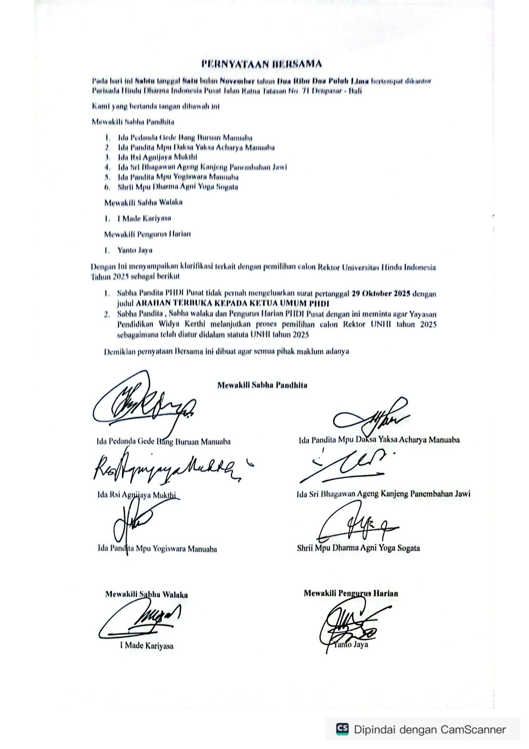 Hasil rapat dadakan itu menyatakan (1) bahwa Sabha Pandita tidak pernah mengeluarkan surat tertanggal 29 Oktober 2025 dengan judul Arahan Terbuka kepada Ketua Umum PHDI; (2) Sabha Pandita, Sabha Walaka dan Pengurus Harian PHDI meminta kepada Yayasan Pendidikan Widya Kerthi untuk melanjutkan proses pemilihan rektor UNHI tahun 2025 sebagaimana telah diatur di dalam statuta UNHI tahun 2025.